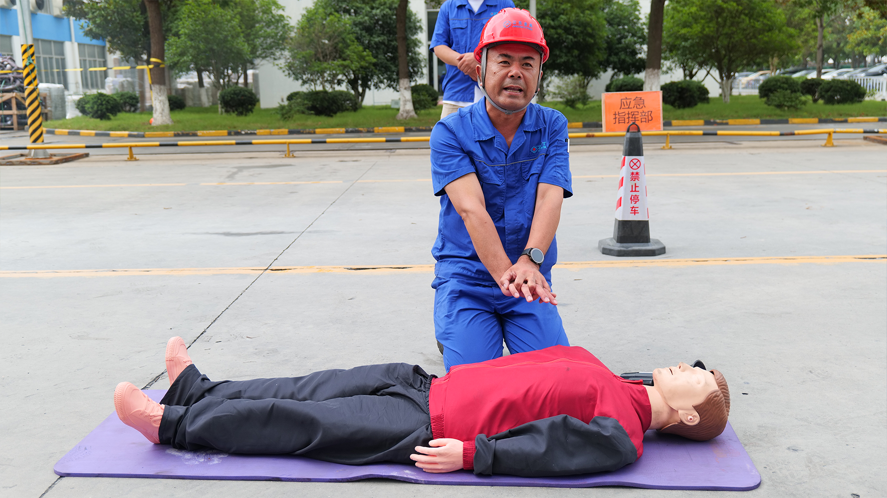 與此同時,救護人員把一名員工從車間抬出,由王文虬向大家演示人工呼吸和心肺復蘇的方法與步驟;